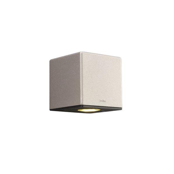 Subtile kubusförmige Wandarmatur aus warm-silber beschichtetem Aluminium. Erzeugt warmweißes Licht. CUBID eignet sich beispielsweise für Teichufer und Pergolen.