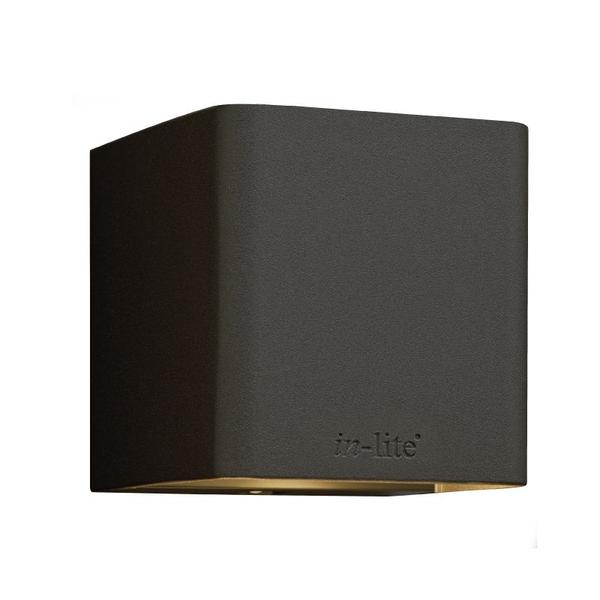 Subtile kubusförmige Wandarmatur aus dunkelgrau beschichtetem Aluminium. Erzeugt warmweißes Licht. CUBID DARK eignet sich beispielsweise für Teichufer und Pergolen.